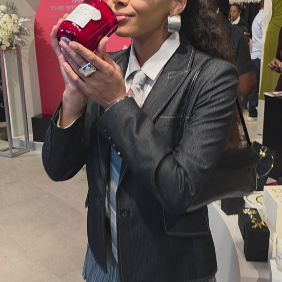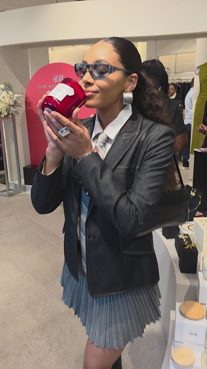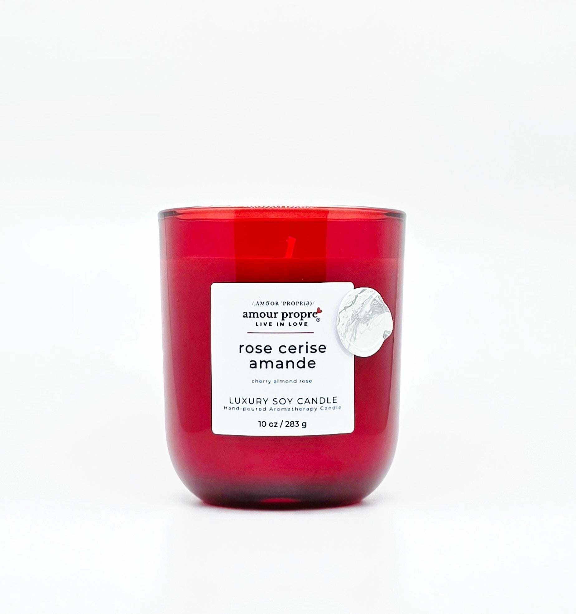 A sensual and decadent fusion of dark cherry, soft rose petals, and warm almond. This rich, flirty aroma is housed in our signature Red Aura vessel for a bold, romantic touch. Hand-poured soy blend.